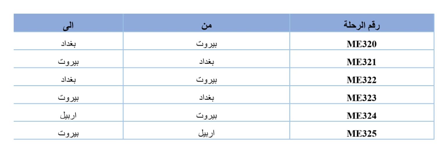 - نظراً لإستمرار إغلاق المجال الجوي العراقي، تعلن شركة طيران شرق الأوسط – خطوط الجوية اللبنانية عن إلغاء رحلاتها إلى العراق (بغداد و اربيل) ليوم السبت 21 حزيران 2025 وفق الجدول التالي: